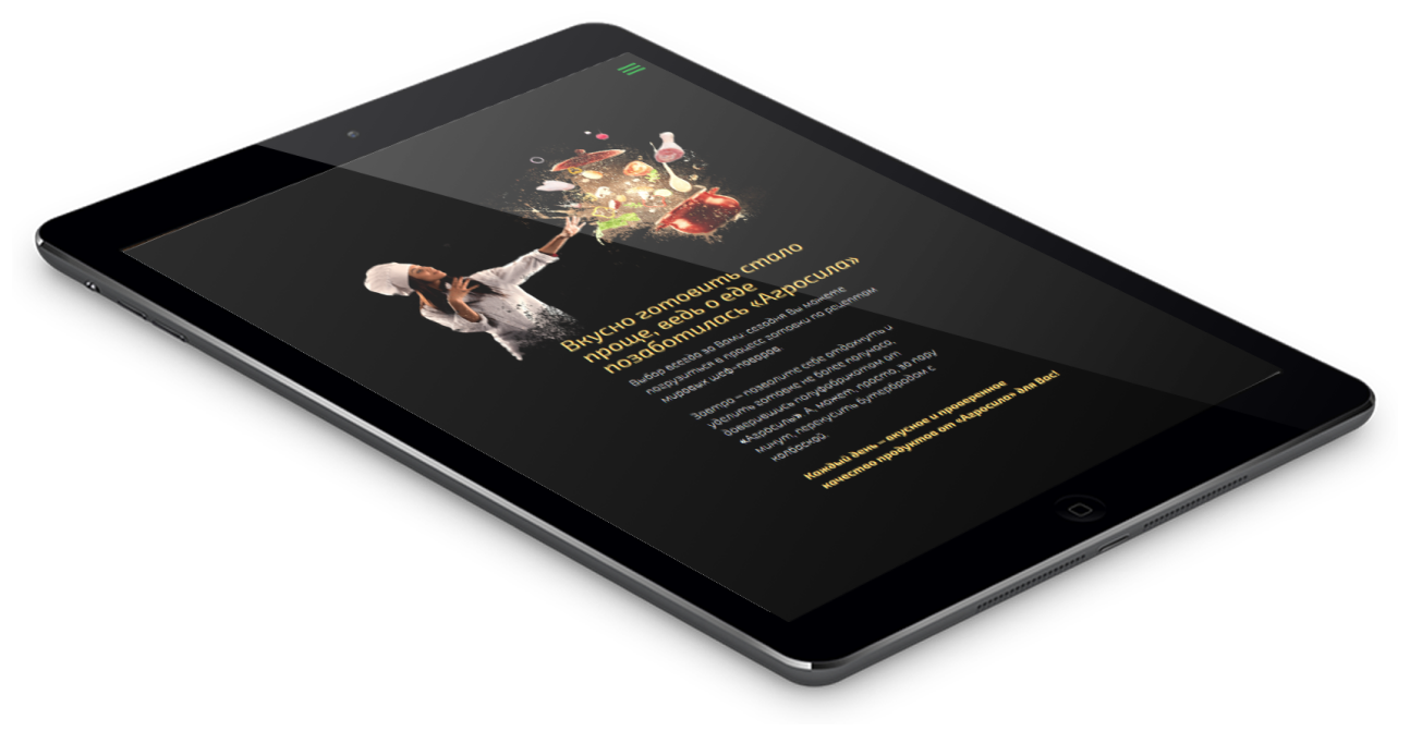 Анимация всё делает сама: слайдер автоматически меняет аппетитные фотографии, каждый элемент вкуса двигается в пространстве экрана, чтобы подчеркнуть особенности продукции.