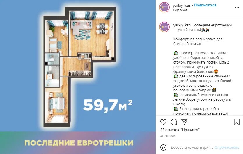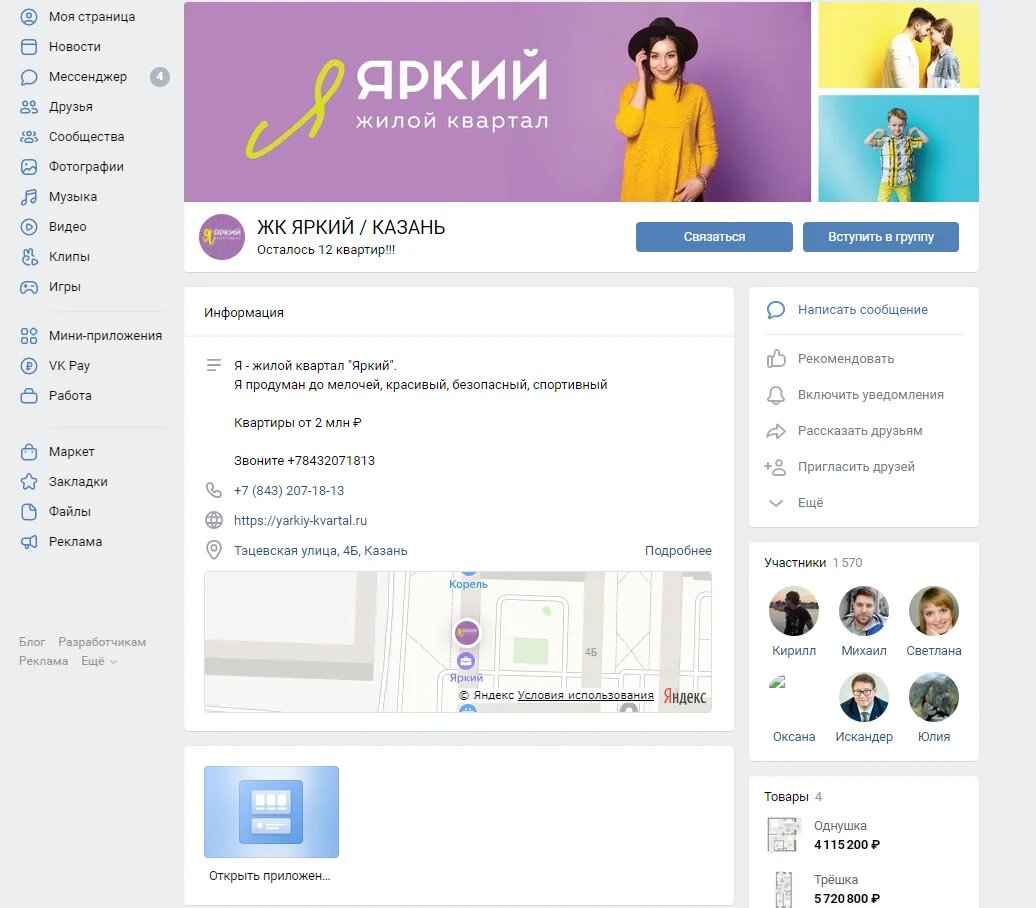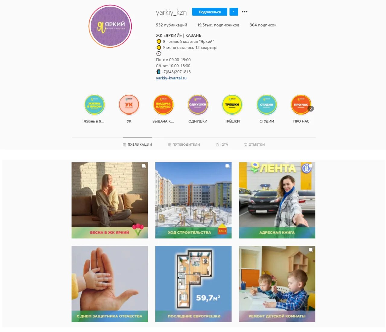 • В каждой публикации есть контакты ЖК «Яркий» и призыв к действию: «Приезжайте на просмотр или на экскурсию, посмотрите дома. Покажем, как уютно и недорого обставить квартиру-студию» и так далее. Клиент реагирует на призыв, пишет сообщение или звонит, чтобы уточнить подробности.