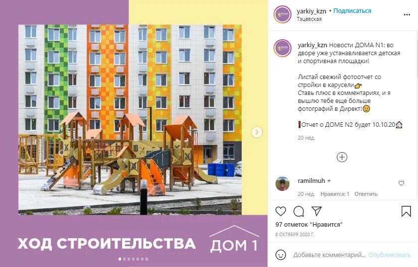 • Видит в наших публикациях ответы на интересующие его вопросы или задаёт вопросы в комментариях, если не может найти ответ. После этого часть аудитории загорается идеей жить в нашем ЖК — в той атмосфере и в тех условиях, которые мы описываем.